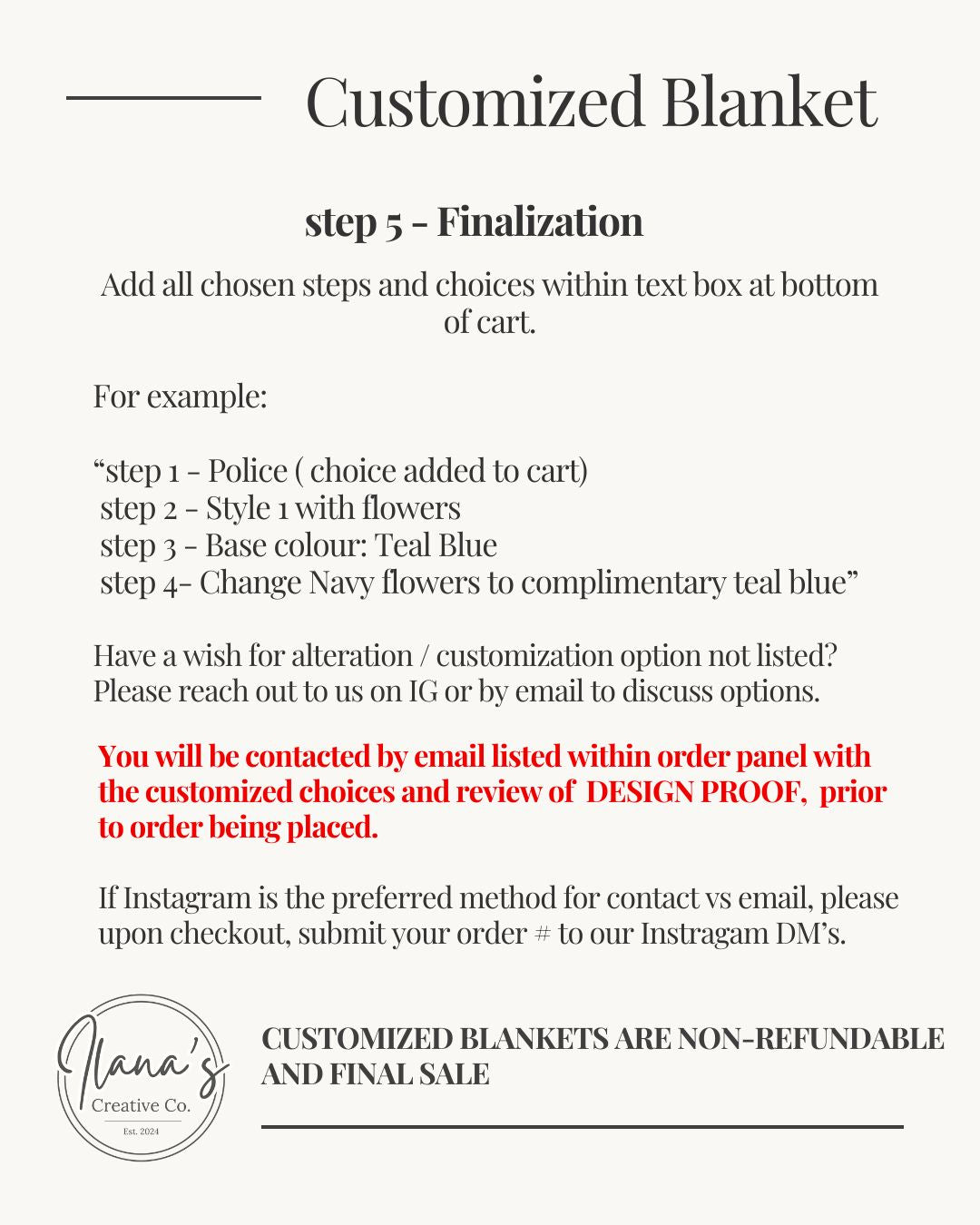 Customized Blankets are final sale - and non refundable. Please allow for a turnaround time of 6-8 weeks for design, production and shipment.